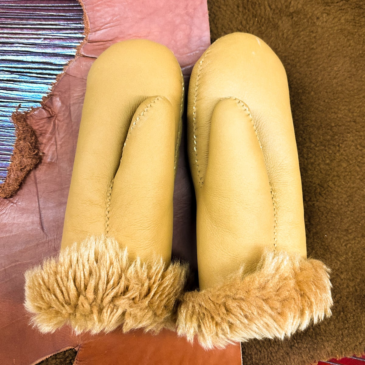 We offer a range of pattern sizes to ensure you leave with a pair of mittens that fits you, crafted in the same style as shown in the photo. The sheepskin used this year features a napa finished top (photos shown in various lights), adding a soft yet sturdy touch to your creations.