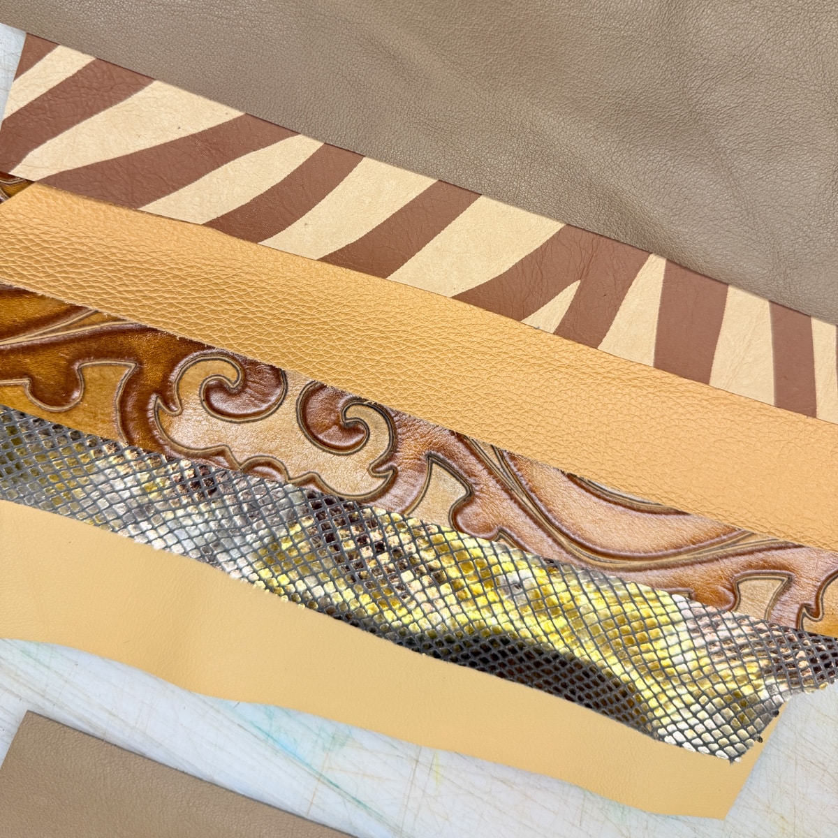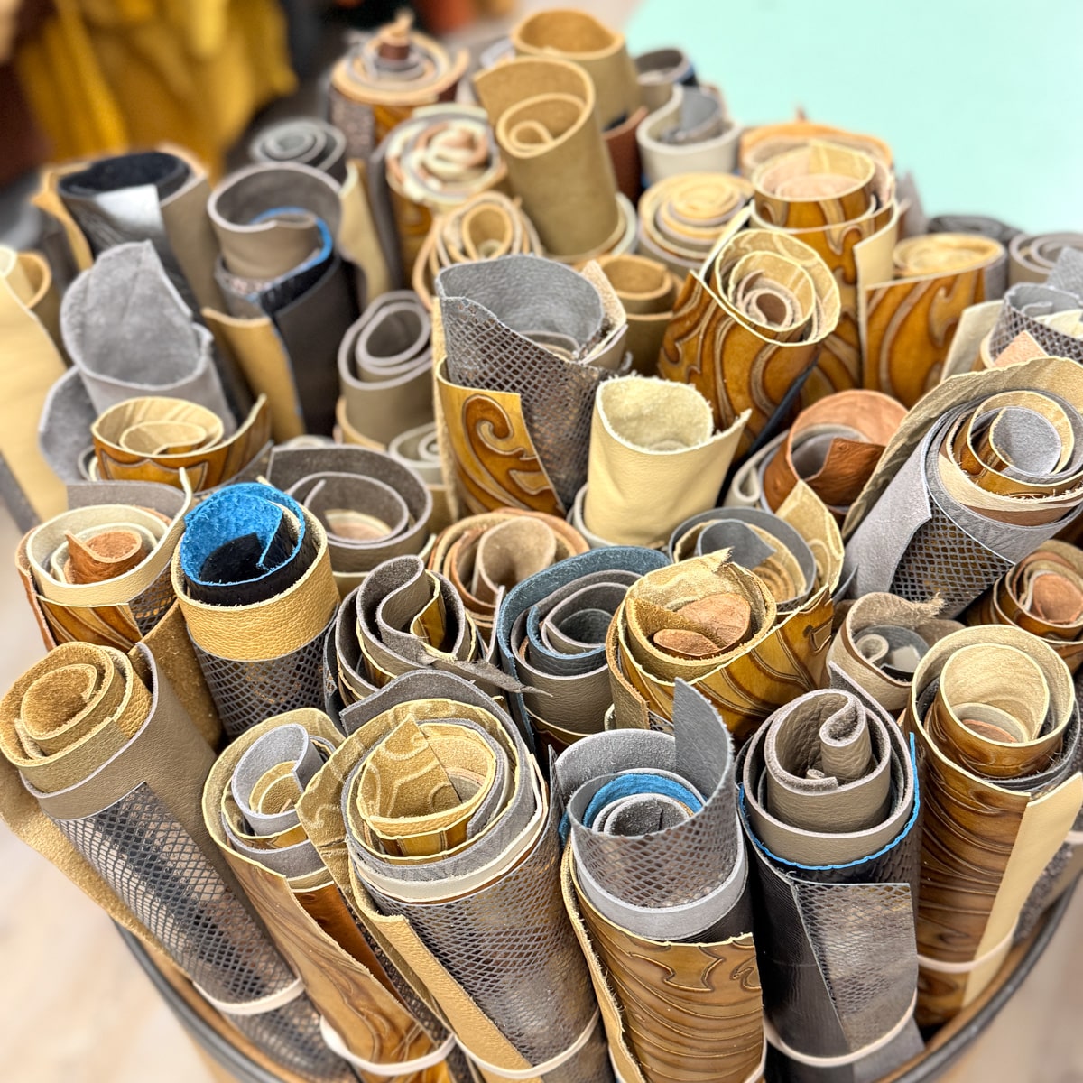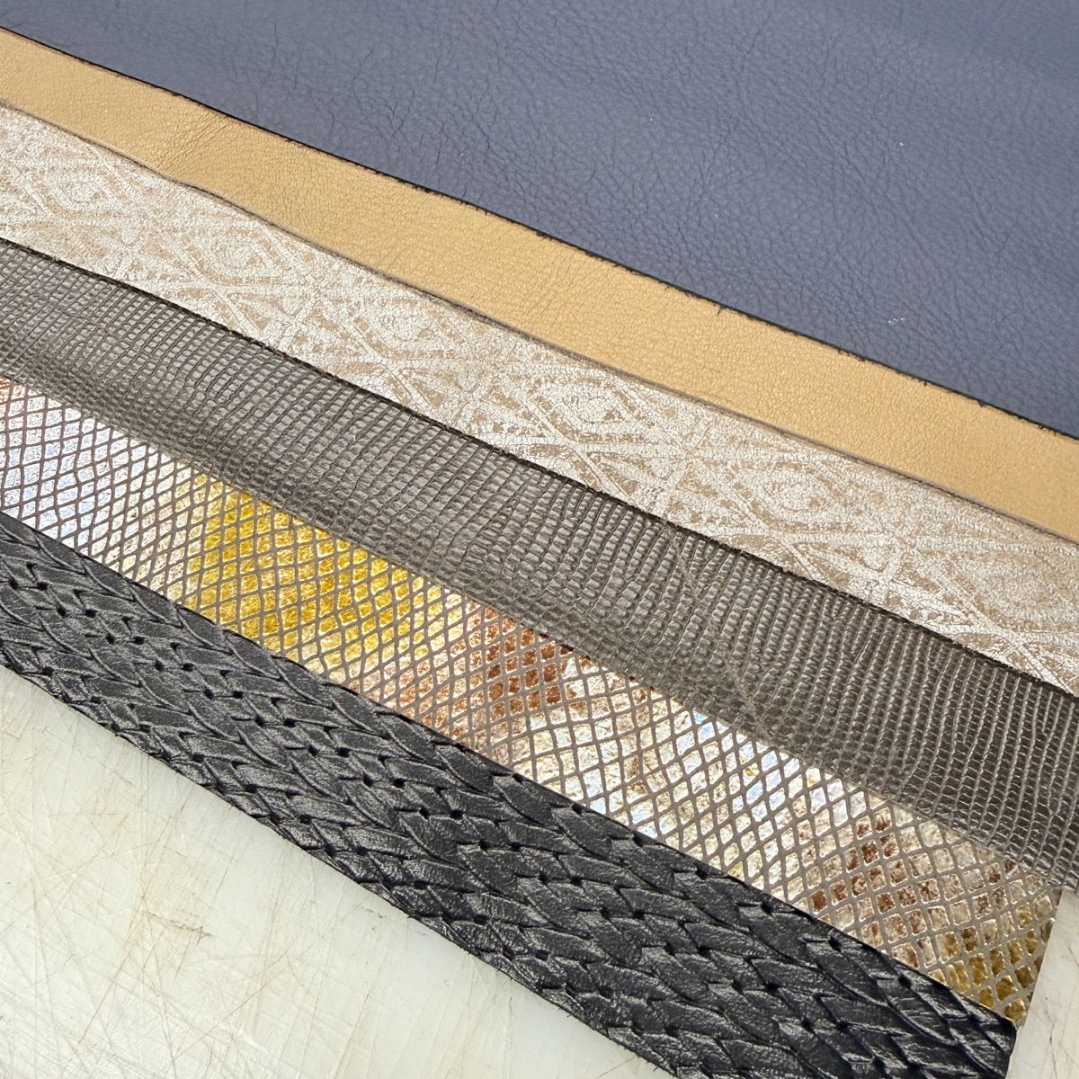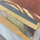 Each bundle includes six pieces of upholstery-weight leather from our oddlot and end-of-run selection. These leathers feature a mix of colours, textures, and prints — many of which we won’t be able to get again.