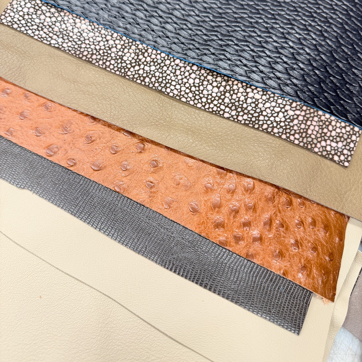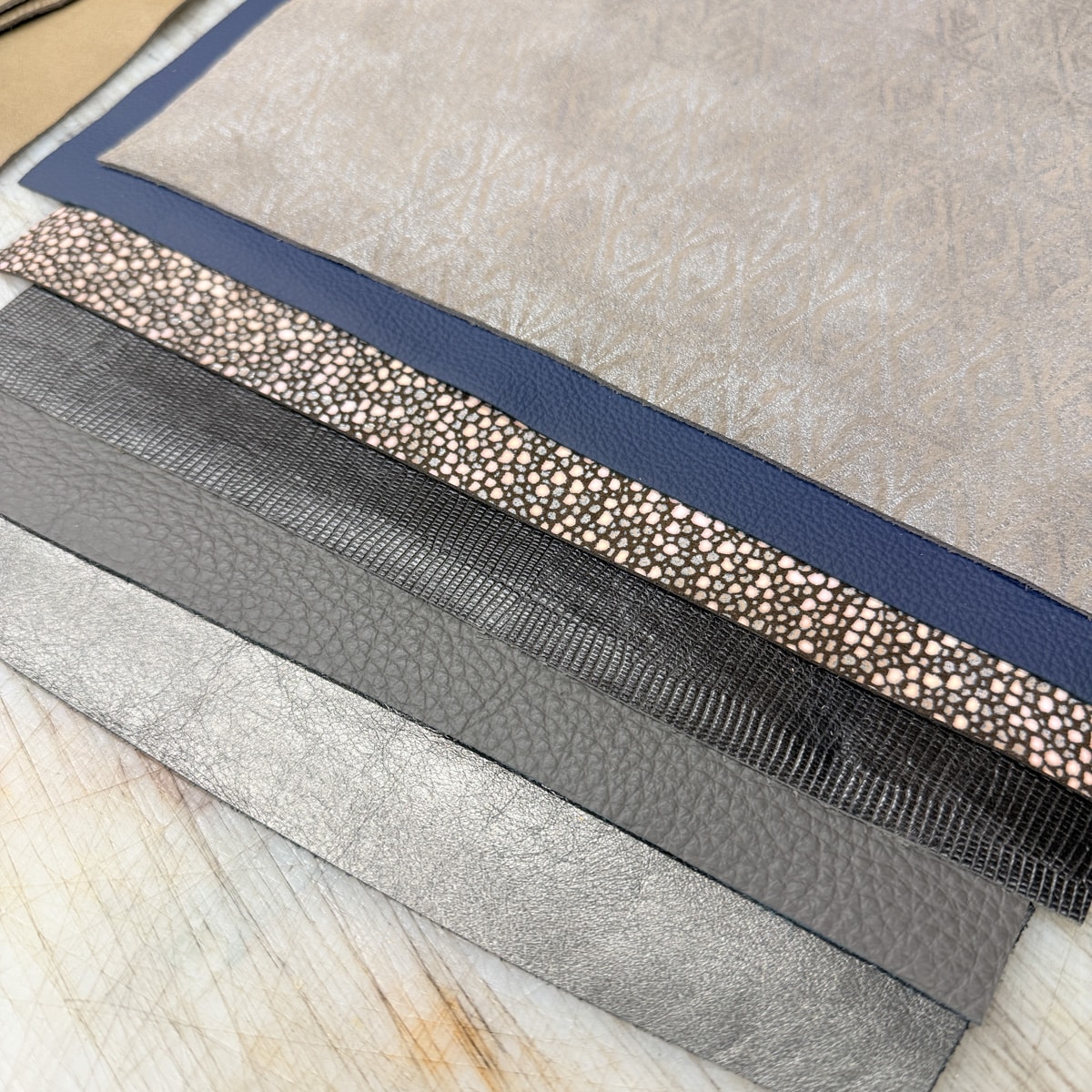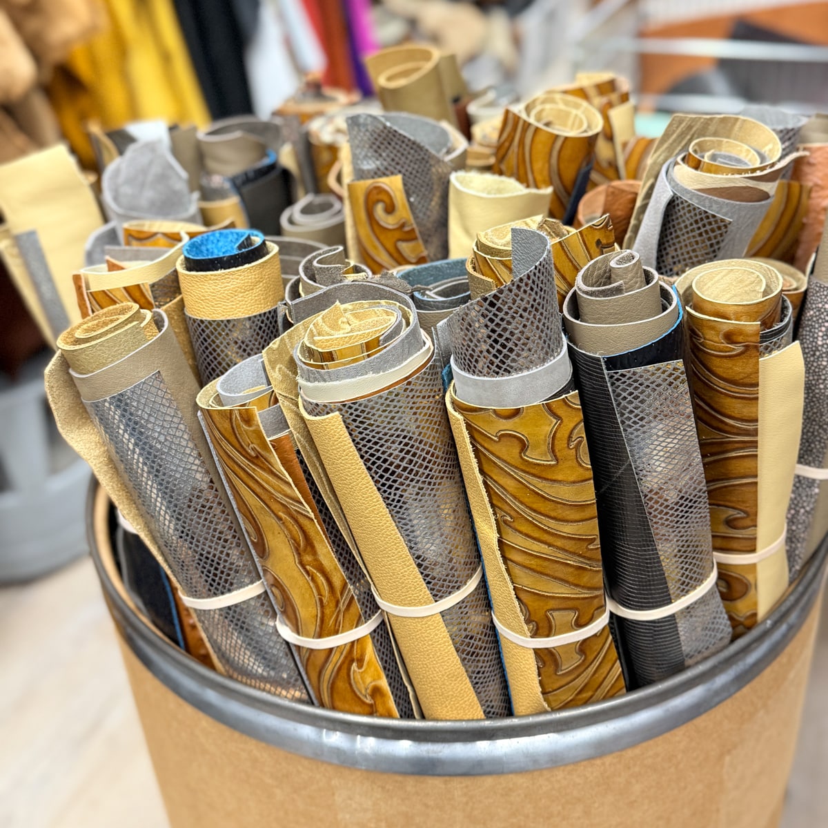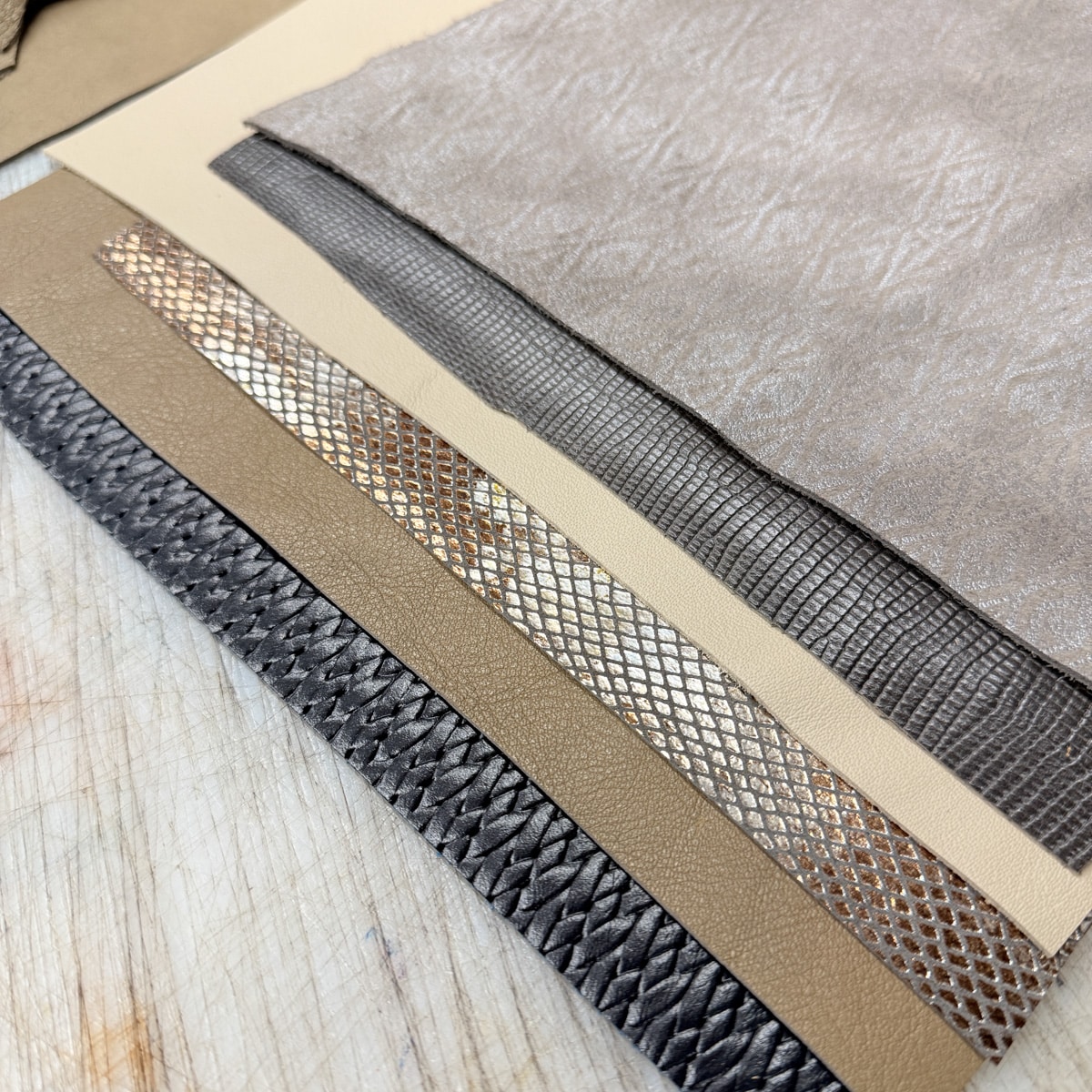 Each bundle includes six pieces of upholstery-weight leather from our oddlot and end-of-run selection. These leathers feature a mix of colours, textures, and prints — many of which we won’t be able to get again.